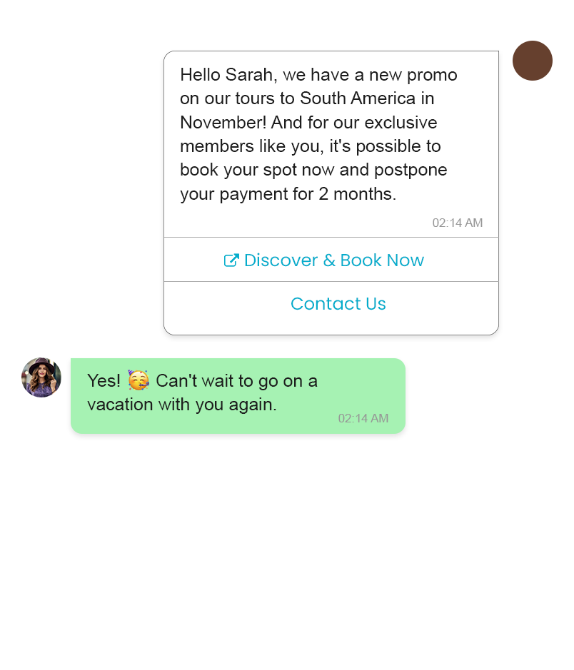 Engage your customers with promotional campaigns, invite them to digital events, and leverage WhatsApp call-to-action buttons for inbound marketing on your website and social media platforms. Expand your reach and drive customer interaction through WhatsApp's powerful communication channels.